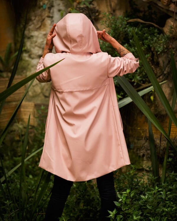 Abrigo largo tipo parka, hecho en tela sintética 100% impermeable – capota amplia, bolsillos laterales grandes, sistema de cierre de cremallera y broches, interior forrado. Tiene almilla en espalda y charreteras decorativas.