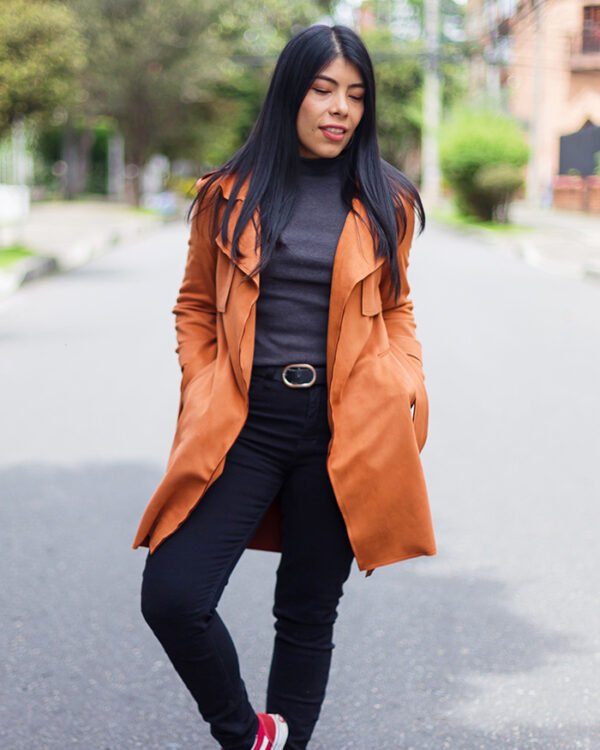 Abrigo largo en tela gamuzada, con costuras expuestas, cuello, solapa, cinturon de ajuste, charreteras y almillas decorativas. Silueta estilizada.