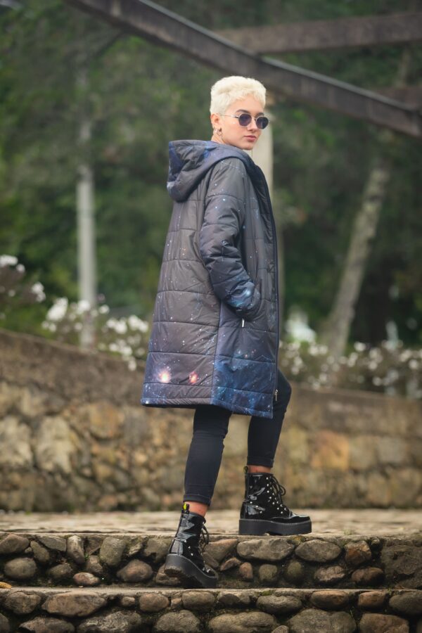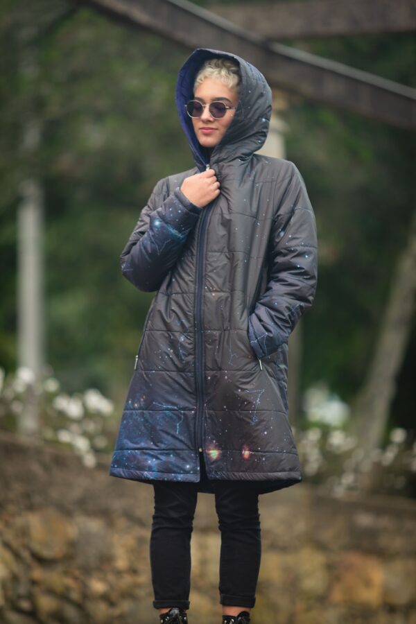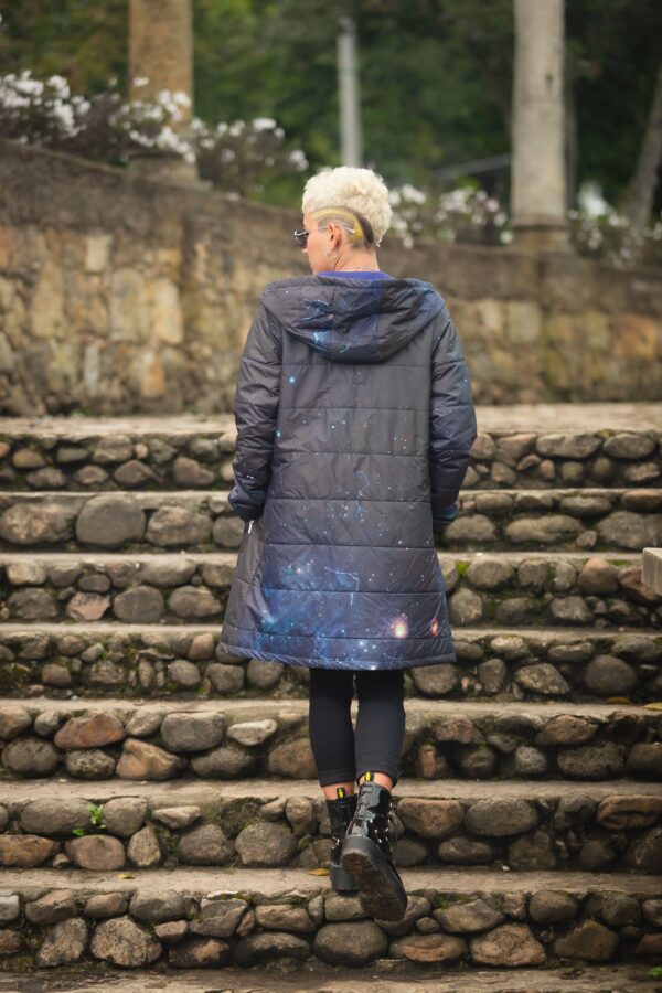 En cuanto a la referencia Constelaciones, es una fotografía del telescopio Hubble, sí, una imagen real de las profundidades de nuestra galaxia infinita. ¿Cómo sentirte parte de un todo cuando, al parecer, somos partículas en el aire? Bueno, esta prenda es para aquellos que viajan por cuestiones filosóficas con mucha trascendencia.