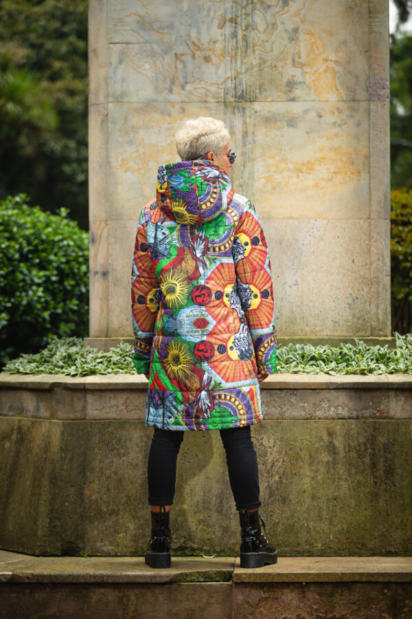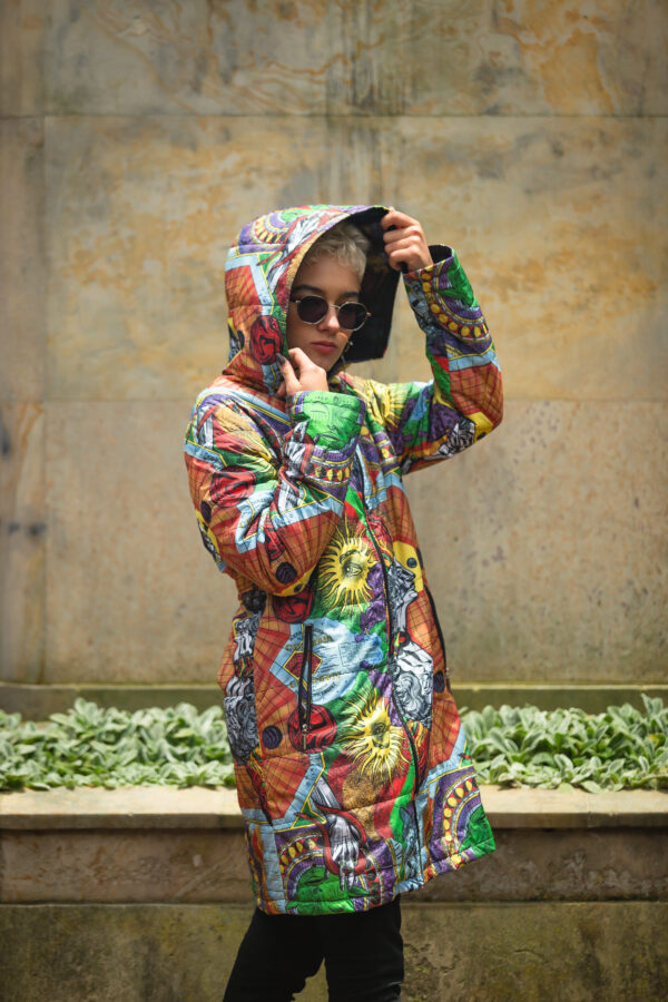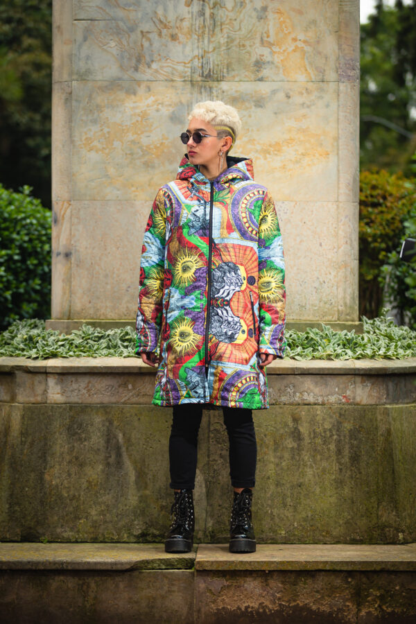 La CHAQUETA IGLU RETRO, es una prenda amplia, comoda, impermeable y rompevientos, con capota y una cremallera de doble vía que permite abrir y cerrar en ambos sentidos, de esta forma puedes llevarla como una capa. Es perfecta para ocasiones al aire libre, en donde no sabes si encontrarás lluvia o fuertes vientos. Llevala en los momentos en que necesitas practicidad en el frío . La ilustración Retro es una composición inspirada en paisajes capitalinos combinados con una fascinación psicodélica. Por supuesto, hablando de protagonismo rolo, nuestro bello copetón “Zonotrichia capensis”, un pequeño habitante de nuestra capital que embellece la urbe con sus cantos, combatiendo el ruido aturdidor.