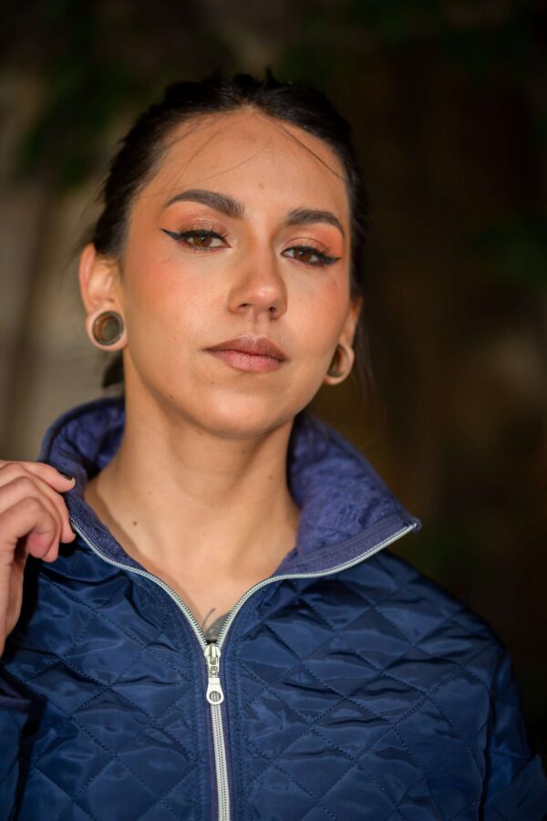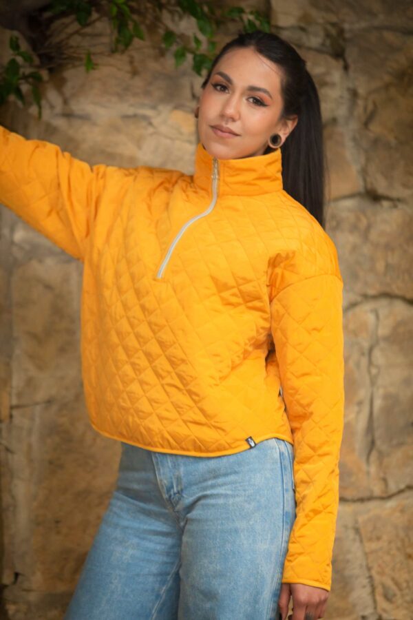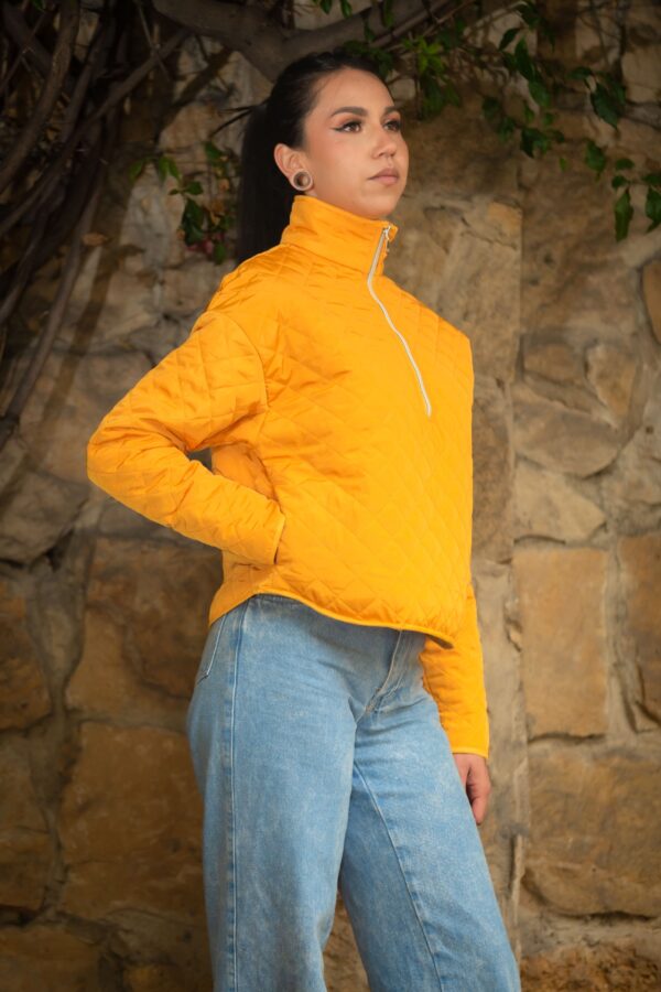 Buzo de cuello alto y cremallera hecho en ropevientos acolchado en diagonales. El interior es de peluche muy calientito y cómodo. Tiene bolsillo laterial con cremallera invisible. Perfecto para un dia al aire libre, climas frios y templados.