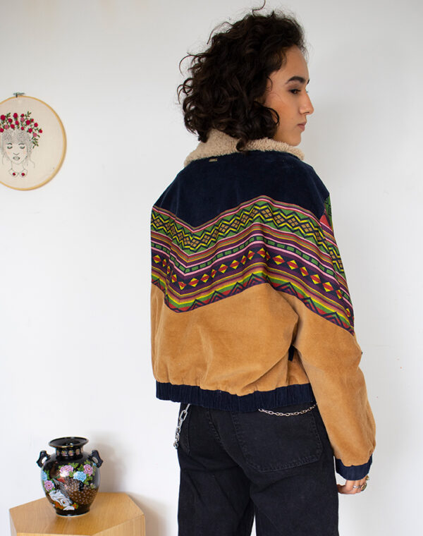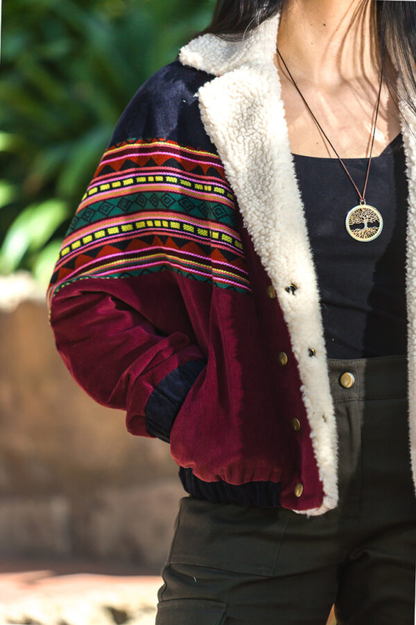 La CHAQUETA AGUAYO de Mazorca hecha con una combinacion de tejido hecho a mano originario de los andes y caracterizado por sus colores vivos armonia geomética. Su estructura amplia y al rededor de los hombros hacen de este corte circular una consecusion de figuras que combinan muy bien con la pana algodon y el ovejero. Tiene un estilo muy vintage y alternativo.