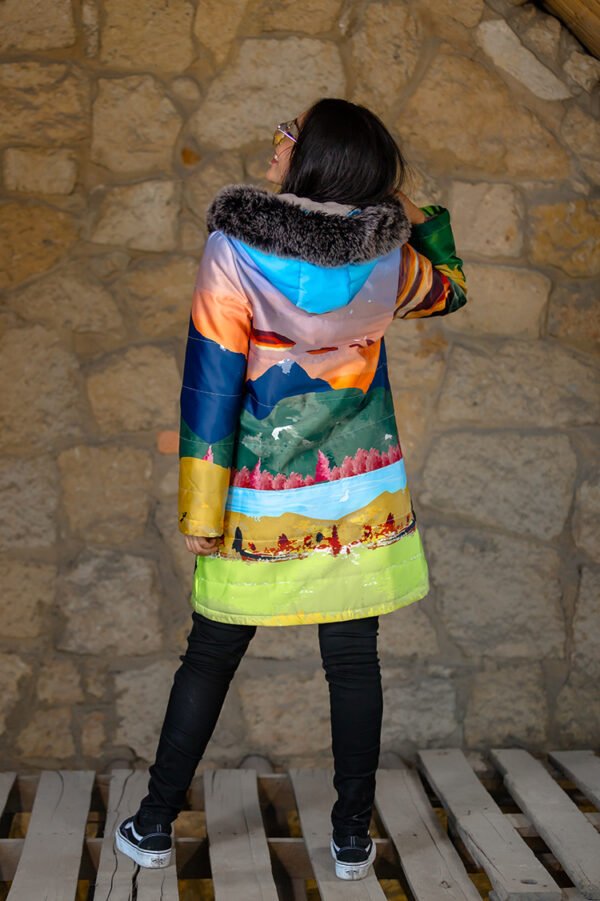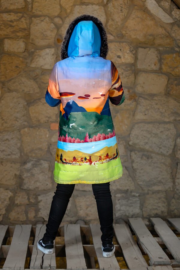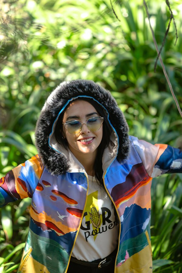 La CHAQUETA IGLU VIEW Es una chaqueta amplia, comoda, impermeable y rompevientos, con capota y una cremallera de doble vía que permite abrir y cerrar en ambos sentidos, de esta forma puedes llevarla como una capa. Es perfecta para ocasiones al aire libre, en donde no sabes si encontrarás lluvia o fuertes vientos. Llevala en los momentos en que necesitas practicidad en el frío . Esta fondeada con un PRINT de muchos colores que unidas todas sus piezas (delanteros, mangas, espalda y capota) forman el dibujo de un hermoso paisaje.