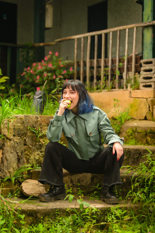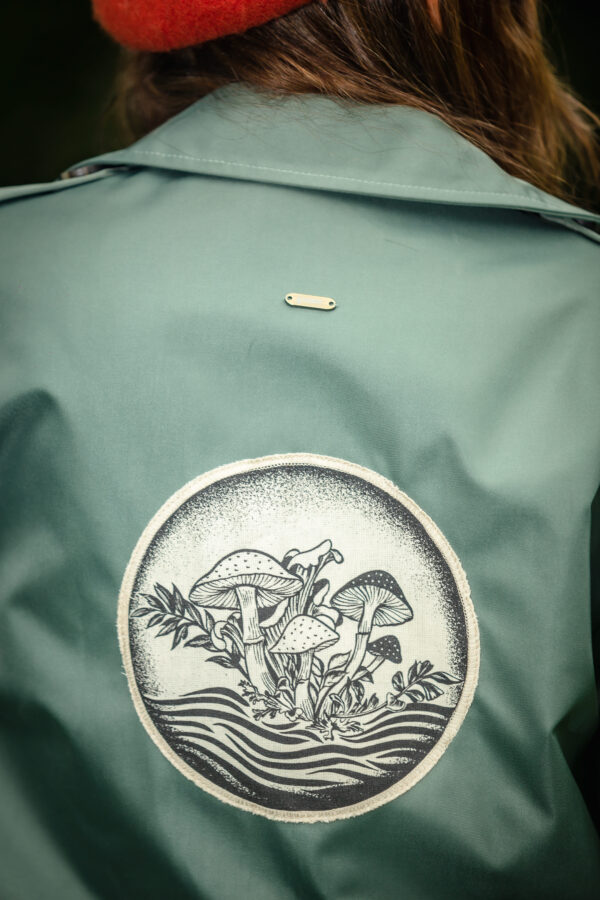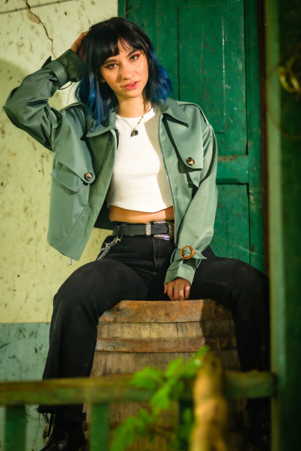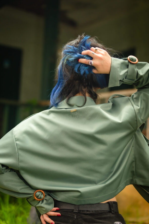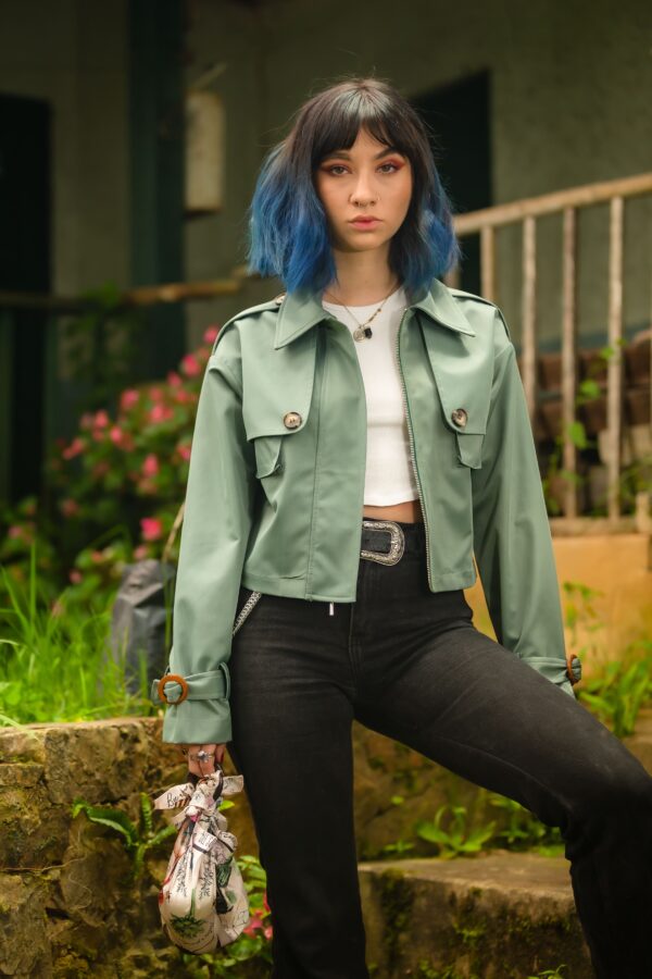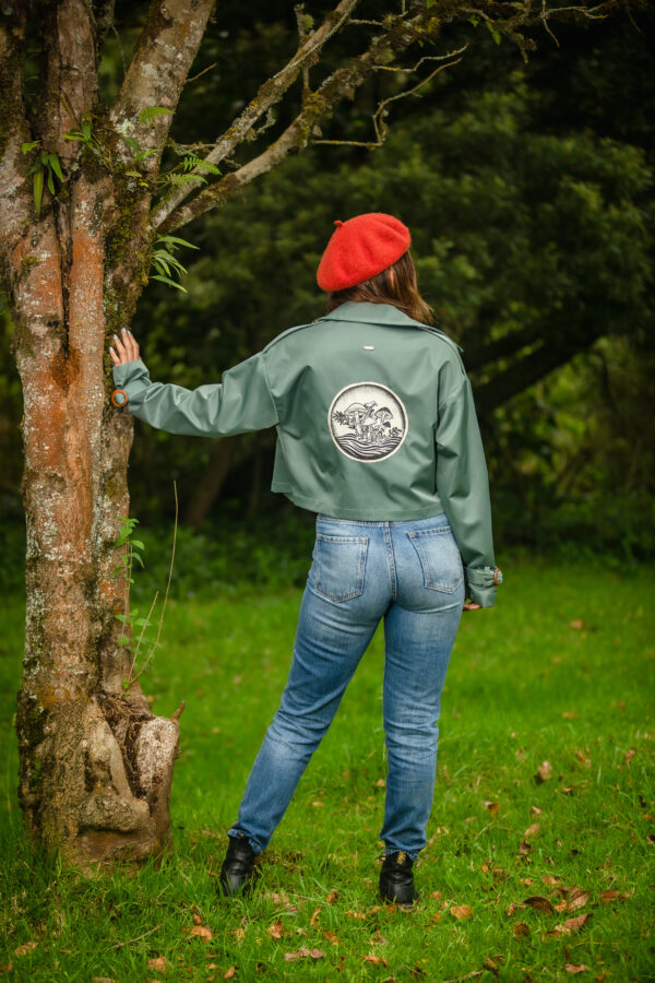 La GABARDINA CORTA MOKSHA de Mazorca es ideal para lucir la curva de la cadera. Su estilo militar (charreteras) da un aire sosfisticado. No es forrada en su interior lo que la hace liviana, tiene cierre frontal de cremallera, las charreteras de los puños tienen hebilla de cierre redondo en madera y su espalda amplia se presta para que la personalices con algun parche o estampado si quieres darle tu toque de magia adicional.
